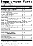 Ingredients: Ashwagandha Root (2.5% extract), Turmeric Root (95% extract), Cinnamon Bark Powder (Cinnamomum wilsonii), Holy Basil Leaf (2% extract), Garlic Bulb (1% extract), Trikatu Powder (consisting of black pepper fruit powder, long pepper fruit powder, and ginger root powder), Triphala Powder (consisting of amla fruit powder [Phyllanthus emblica], bibhitaki fruit powder [Terminalia bellirica], and haritaki fruit powder [Terminalia chebula]), Amla Fruit Powder, Sandalwood Wood Powder (Pterocarpus soyauxii), Cloves Bud Powder, Celery Seed Powder, Licorice Root Powder, Brahmi Leaves (20% extract) (Bacopa monnieri), Shilajit, Cordyceps (mycelium), Lavender Powder (whole plant), Peppermint Leaf Powder, Hydroxypropyl methylcellulose, Vegetable magnesium stearate, Silicon dioxide.