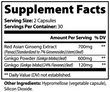 Ingredients: Red Asian Ginseng Extract (Standardized to 7% Ginsenosides)(stem)(leaf), Ginkgo Biloba Leaf Powder, Ginkgo Biloba Leaf 24% Flavones, Hypromellose (vegetable capsule), Silicon Dioxide.