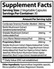 Ingredients: Cordyceps Sinensis Powder, Reishi Mushroom Extract, Shiitake Mushroom Extract, Lions Mane, Proprietary Blend (Maitake Mushroom Extract, Turkey Tail Extract, Chaga Mushroom Extract, Royal Sun Agaricus Extract, White Button Mushroom Extract, Black Fungus Extract, Hypromellose (vegetable capsule), Microcrystalline Cellulose, Magnesium Stearate.